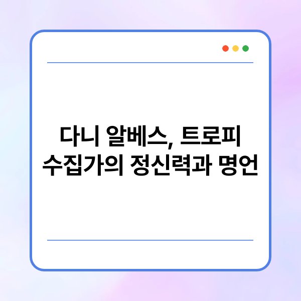 다니 알베스는 세계 축구 역사상 가장 많은 트로피를 수집한 선수로 알려져 있습니다. 그의 트로피 수집가는 단순한 숫자를 넘어, 그가 지닌 정신력과 인생 철학을 대변합니다. 본문에서는 다니 알베스의 트로피 수집 과정과 그의 명언을 통해 팬들에게 전하는 메시지를 다루고자 합니다. 알베스의 경험은 단순한 축구의 영역을 넘어 삶의 자세와 목표 설정에 대한 중요한 교훈을 제공합니다. 그의 이야기와 명언을 통해 독자들은 새로운 시각을 얻을 수 있을 것입니다.
