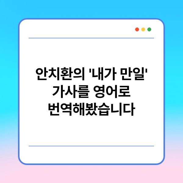 안치환의 '내가 만일' 가사를 영어로 번역하는 것은 한국 문화에 대한 이해를 높이는 데 중요한 역할을 합니다. 영어 번역을 통해 비영어권 국가의 사람들도 이 노래의 메시지를 이해할 수 있습니다. 이는 한국 대중음악의 세계화에 기여하며, 더 많은 사람들에게 한국 문화를 알릴 수 있는 기회를 제공합니다.